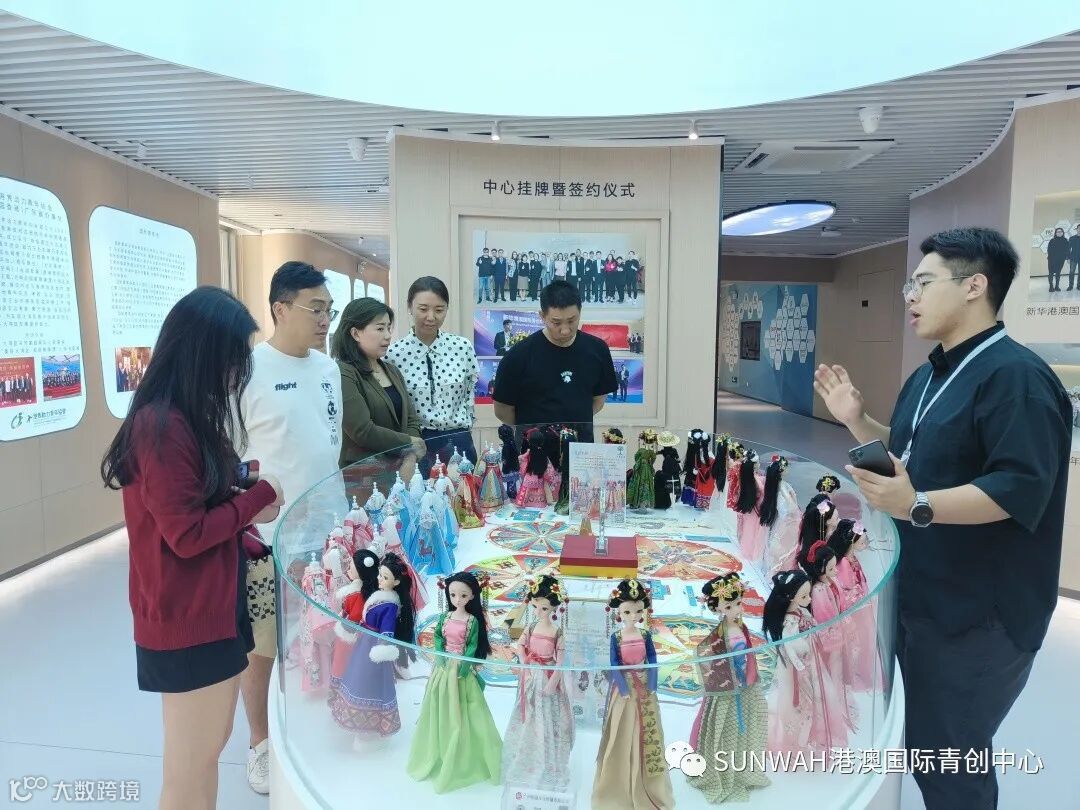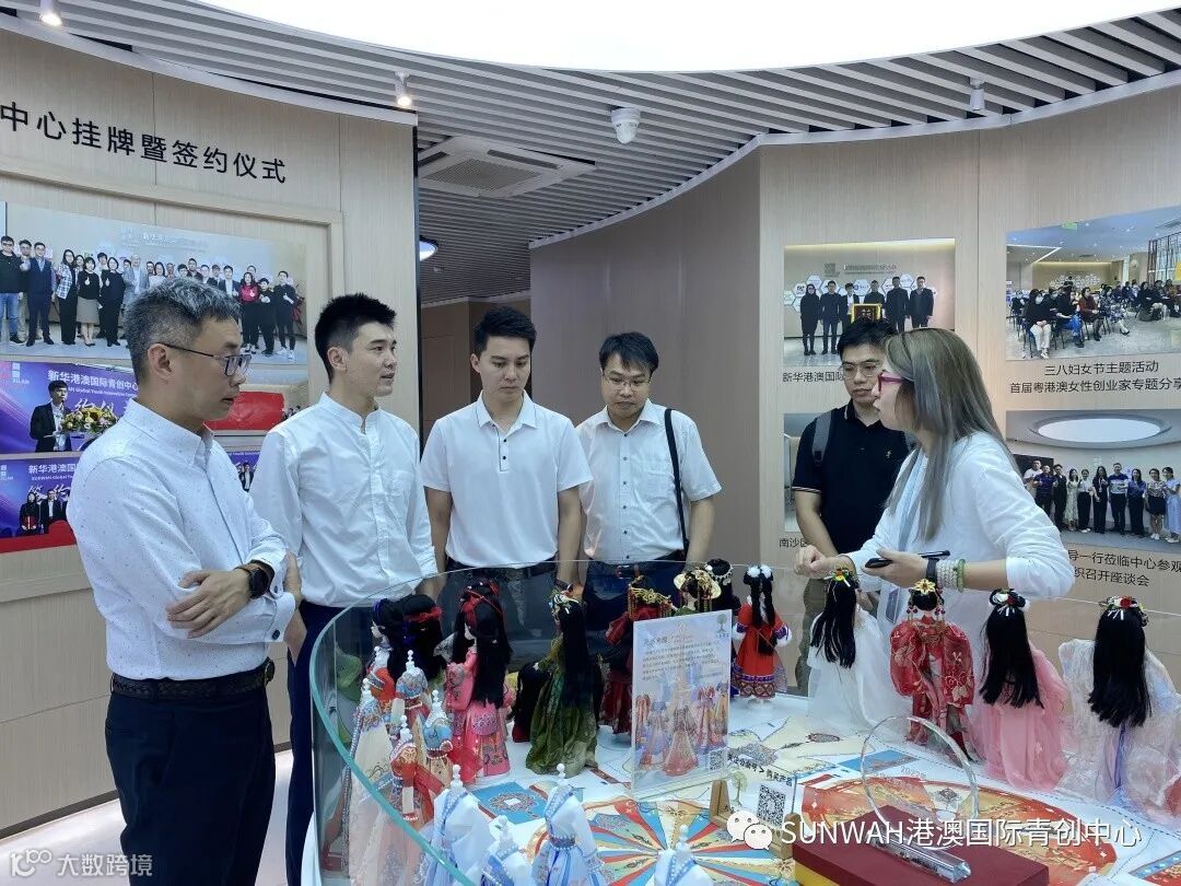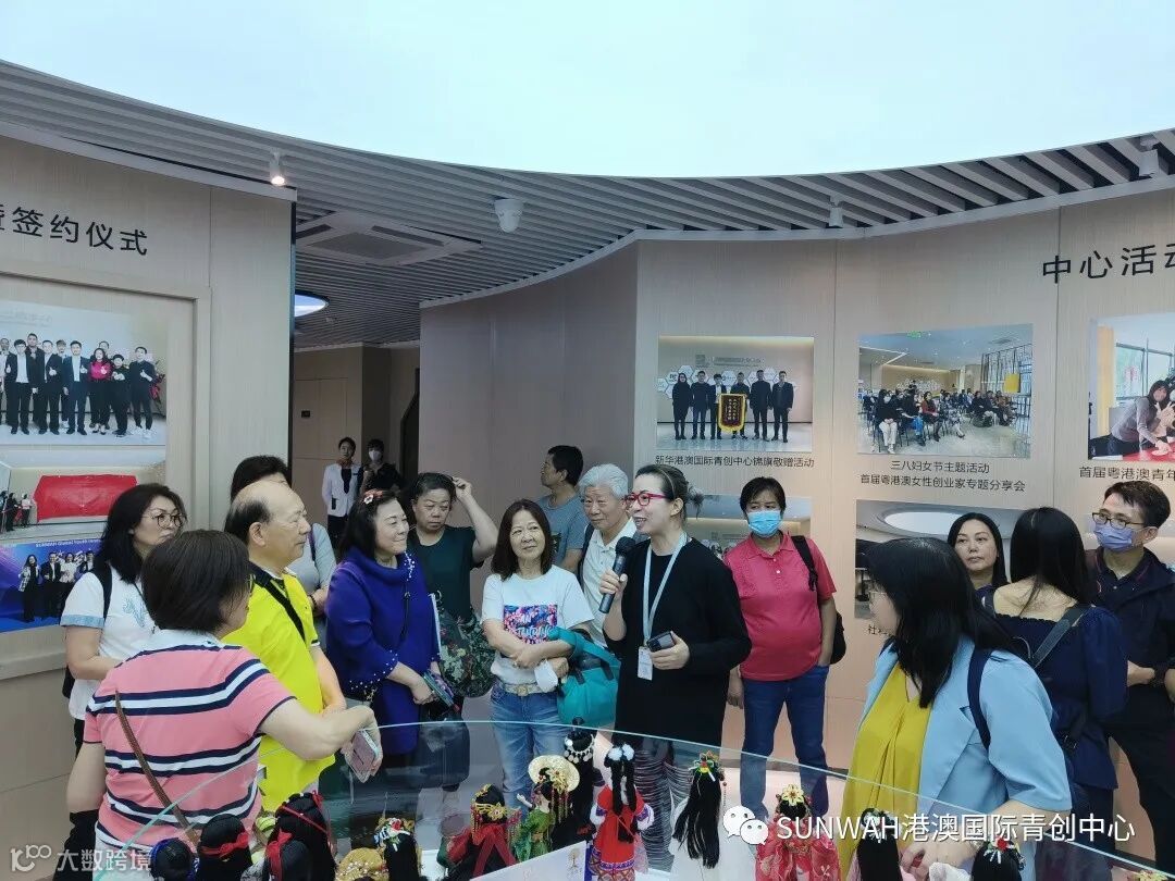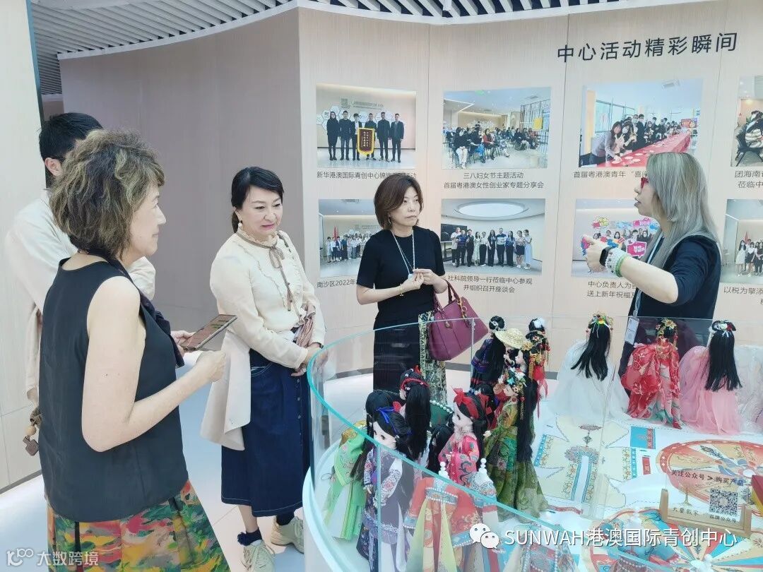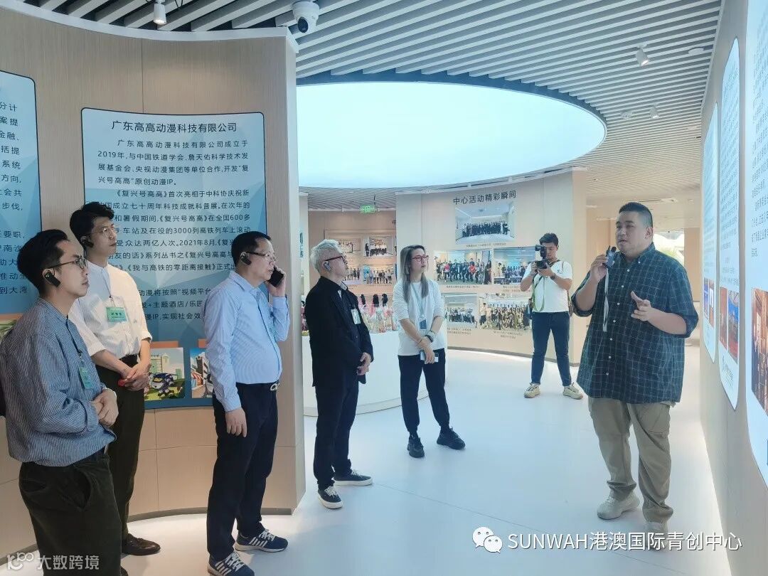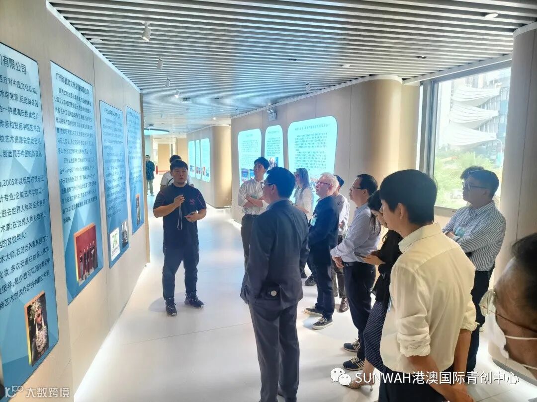 香港艺人蒋丽萍与加拿大华裔团队一行到访中心参观交流,中心负责人蔡总陪同众人参观展厅,并详细介绍本中心自正式揭牌运营至今的项目入驻及资源导入情况。