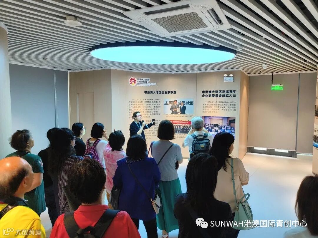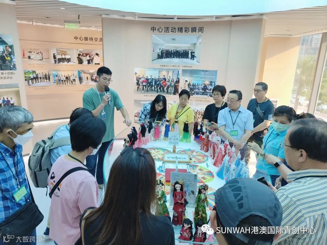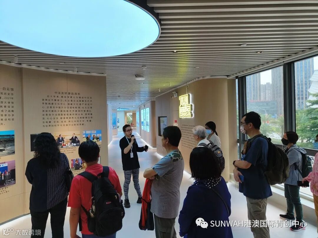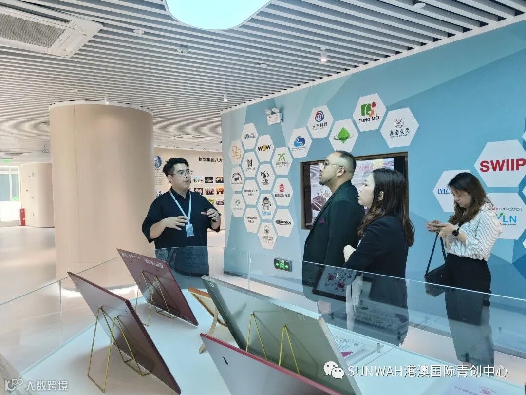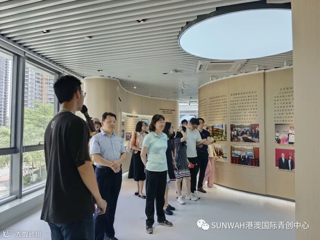 香港艺人蒋丽萍与加拿大华裔团队一行到访中心参观交流,中心负责人蔡总陪同众人参观展厅,并详细介绍本中心自正式揭牌运营至今的项目入驻及资源导入情况。