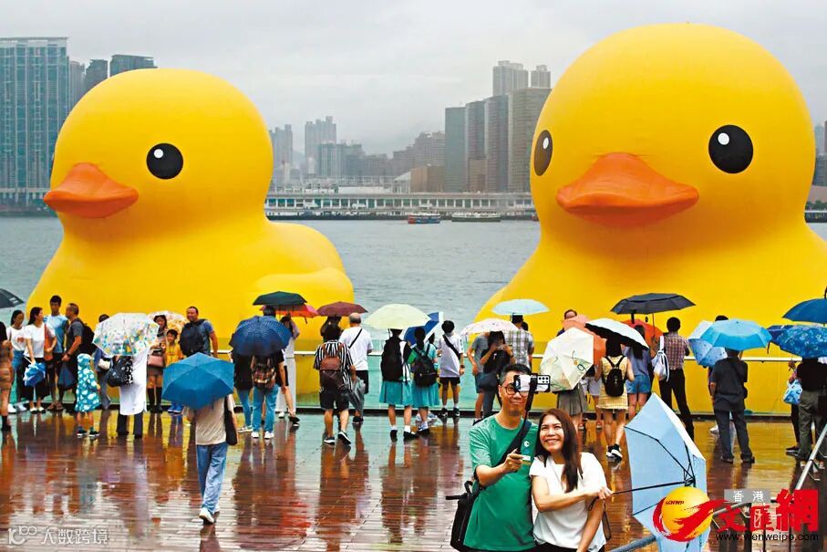 市民、游客顶风冒雨来海滨看大黄鸭。