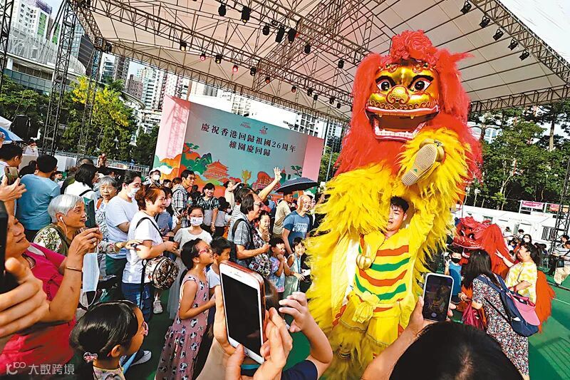 维园舞狮庆祝香港回归祖国26周年,汇集大批民众观看。