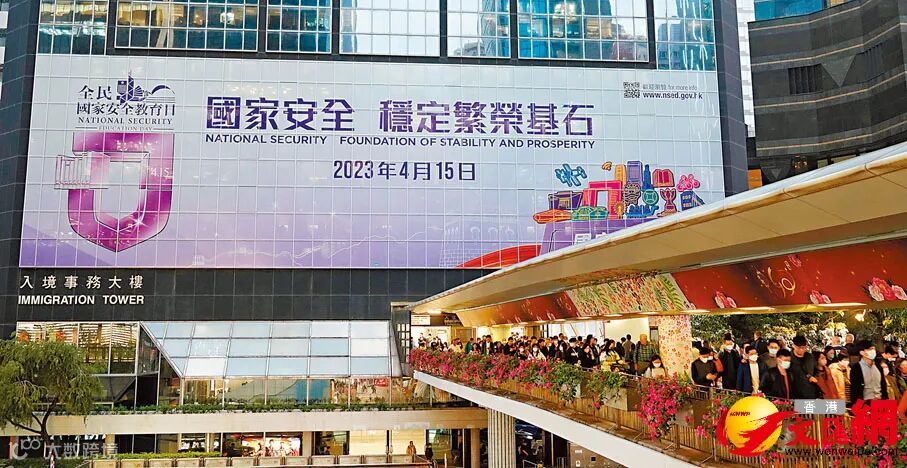 今年全民国家安全教育日,香港入境事务大楼外墙张贴巨幅海报。