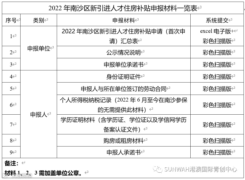 1.2022年南沙区新引进人才住房补贴申请(首次申请)汇总表(模板见附件1,同时提交excel电子版及加盖单位公章扫描版)。