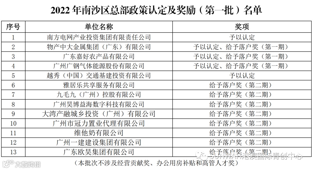 近日,2022年南沙区总部政策认定及奖励企业第一批名单已正式公布。本次公布的名单,是今年6月《广州南沙深化面向世界的粤港澳全面合作总体方案》发布后的首批名单。