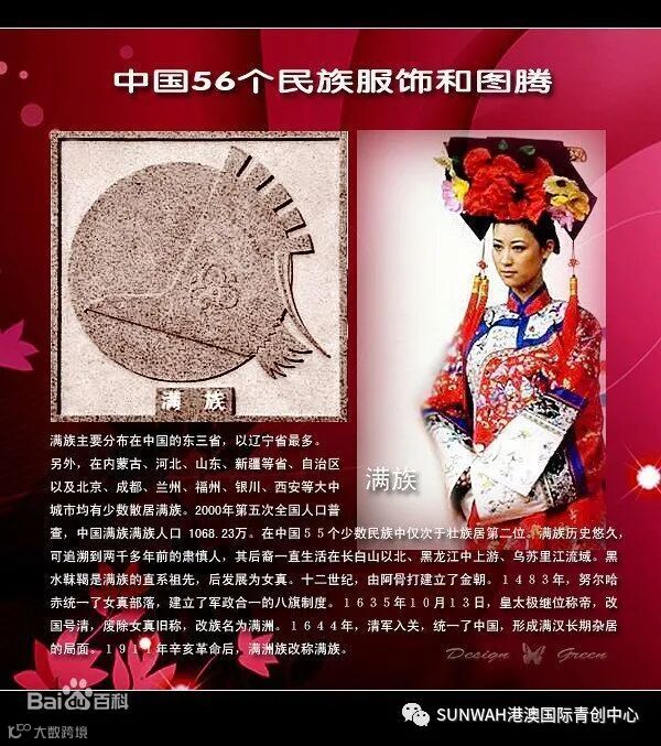 服饰特点:满族妇女一年四季都穿袍服,其中最具特色的旗袍。领、襟、袖的边缘镶上宽边作为装饰。满族把深绛色看作福色,还崇尚白色。早期的面料大多都是用烙铁烫绘的方式绘制在兽皮和毛毡面料上。