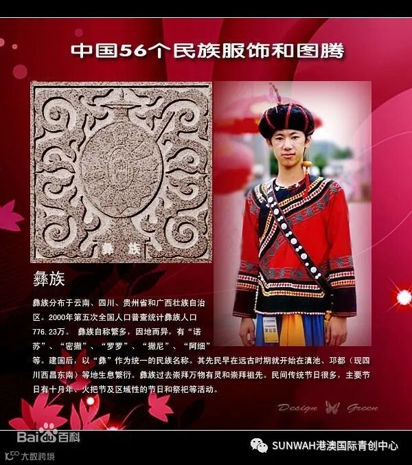 简介:彝分布于云南、四川、贵州省和广西壮族自治区。彝族自称繁多,因地而异,有“诺苏”、“密撒”、“罗罗”、“撒尼”、“阿细”等。建国后,以“彝”作为统一的民族名称。