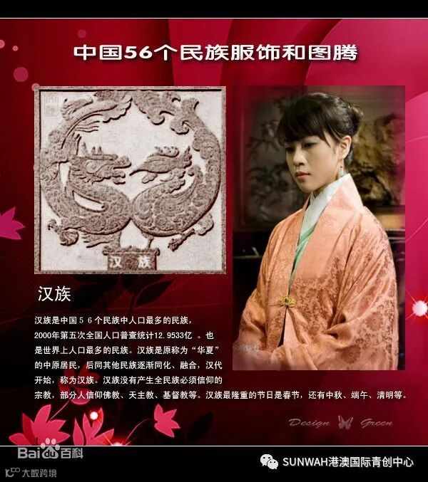 简介:汉族是中国的主体民族。汉族人口为1220844520人,占91.6%(2010,未包括香港、澳门特别行政区和台湾省数据),占全国人口总数的91.51%。汉族的远古先民大体以西起陇山、东至泰山的黄河中下游为活动地区。
