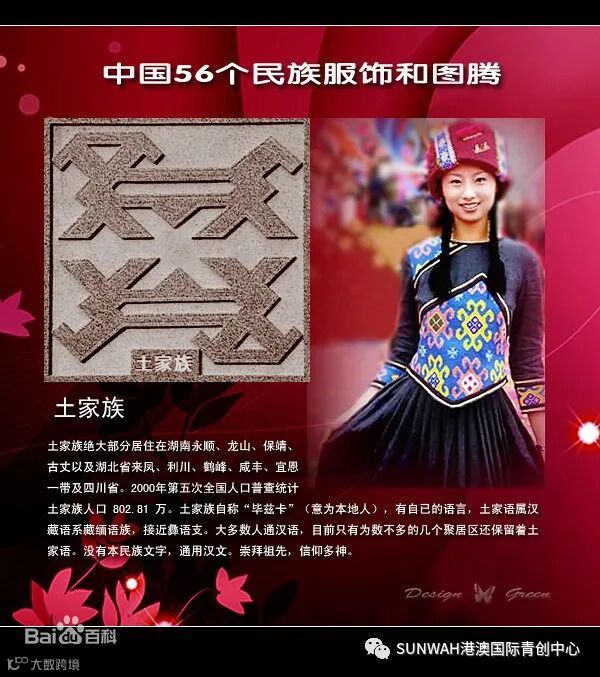 简介:土家族绝大部分居住在湖南、湖北省、贵州省以及四川省(属于重庆市)。土家族自称“毕兹卡”(意为本地人),有自己的语言。大多数人通汉语,只有为数不多的几个聚居区还保留着土家语。
