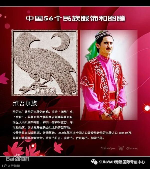 简介:“维吾尔”是维吾尔族的自称,意为“团结”或“联合”。维吾尔族主要聚居在新疆维吾尔自治区天山以南一带,族源可追溯到公元前3世纪游牧过生活的“丁零人”。融合了汉人以及后来迁来的吐蕃人、契丹人、蒙古人繁衍发展而形成了维吾尔族。