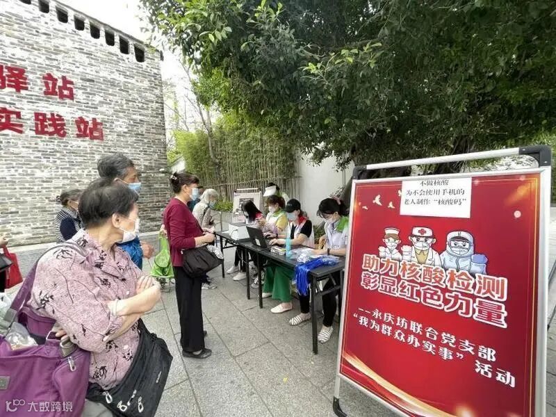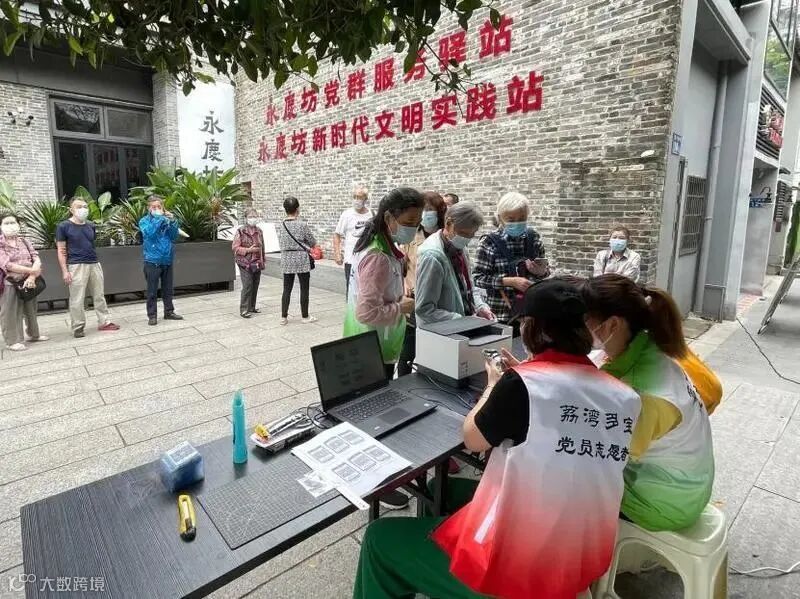 4月16日上午,为方便老人家进行核酸检测,广州市荔湾区永庆坊党群服务驿站启动“我为您扫码”关爱工作,党员、志愿者们利用周末休闲时间,开展“助力核酸检测 彰显红色力量”活动,免费为永庆坊周边老年人制作粤核酸二维码小吊牌。