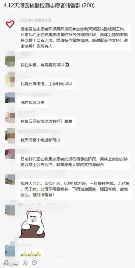 4月12日,天河团区委组建微信群紧急招募核酸检测志愿队伍储备,无数爱心人士加入其中,随时为支援疫情防控一线做准备!