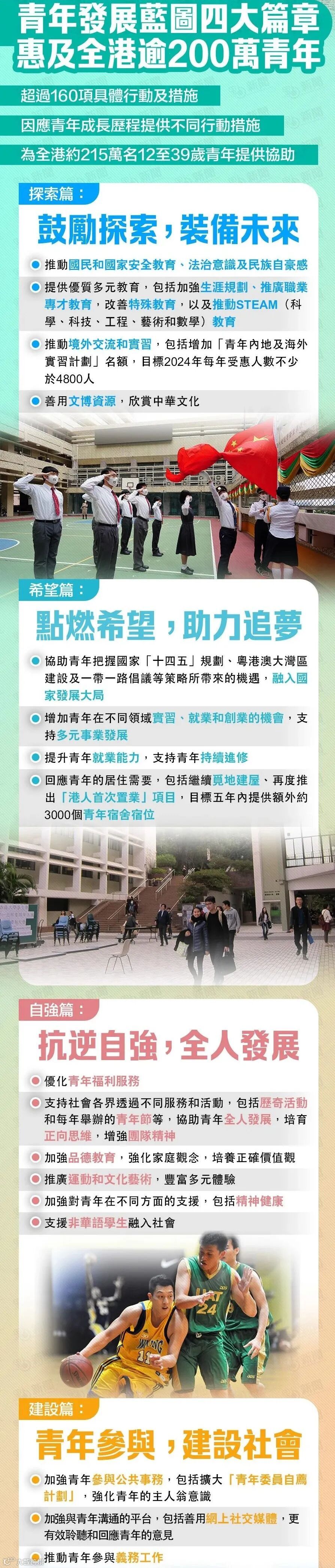 按照青年的成长历程,蓝图分四个篇章阐述特区政府工作方向及相应行动措施。《探索篇》包括强化国民和国家安全教育、法治意识及民族自豪感;提供优质多元教育;推动境外交流和实习等。《希望篇》包括协助青年融入国家发展大局;增加青年在不同领域实习、就业和创业的机会;提升青年就业能力;多管齐下响应青年的居住需要等。《自强篇》包括优化青年福利服务;协助青年培育正向思维;培养正确价值观;推广运动和文化艺术;加强对青年在不同方面的支援等。《建设篇》包括加强青年参与公共事务,强化青年的主人翁意识;加强与青年沟通的平台等。