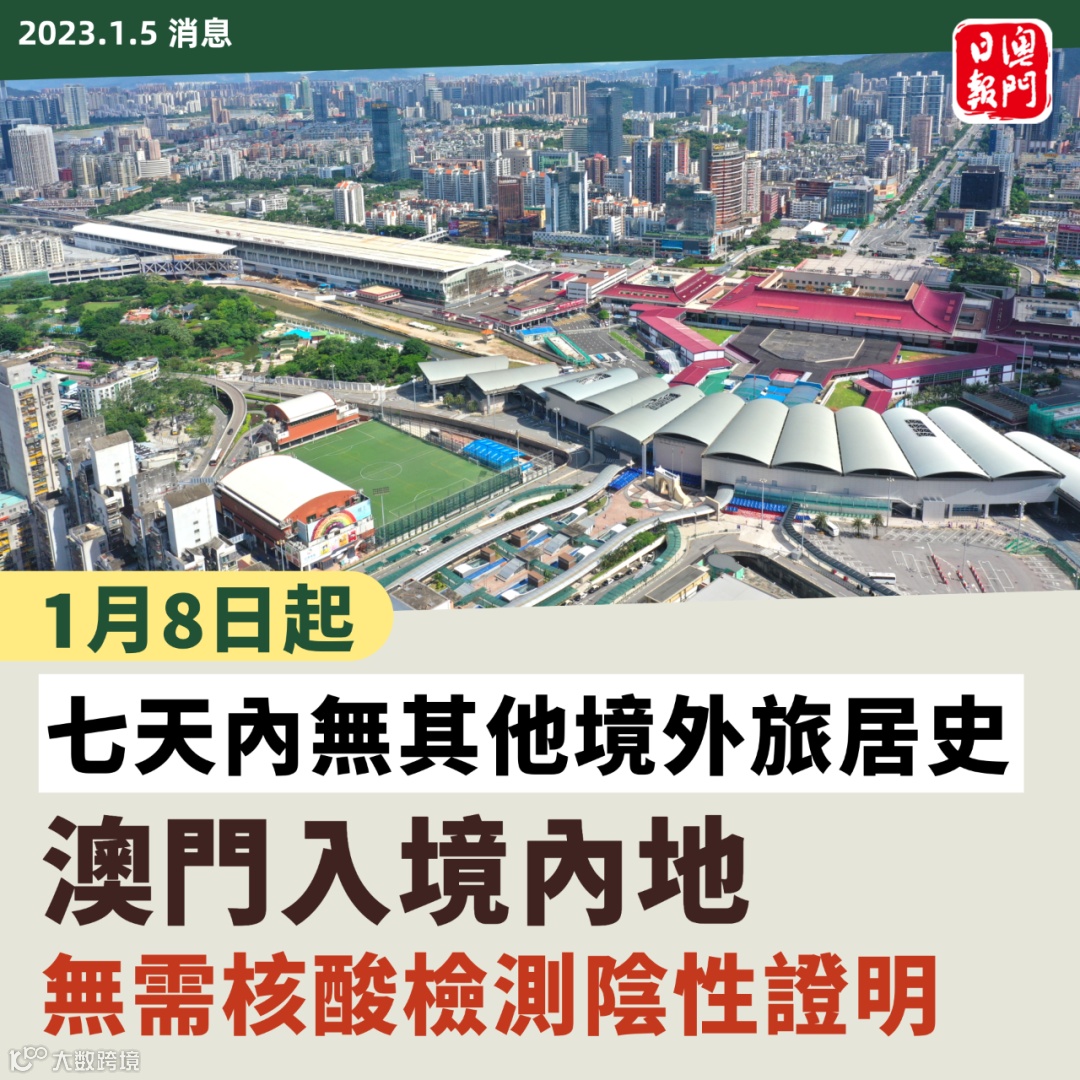 1月8日起,自澳门入境内地人员,如7天内无外国或其他境外地区旅居史,无需凭核酸检测阴性结果入境。