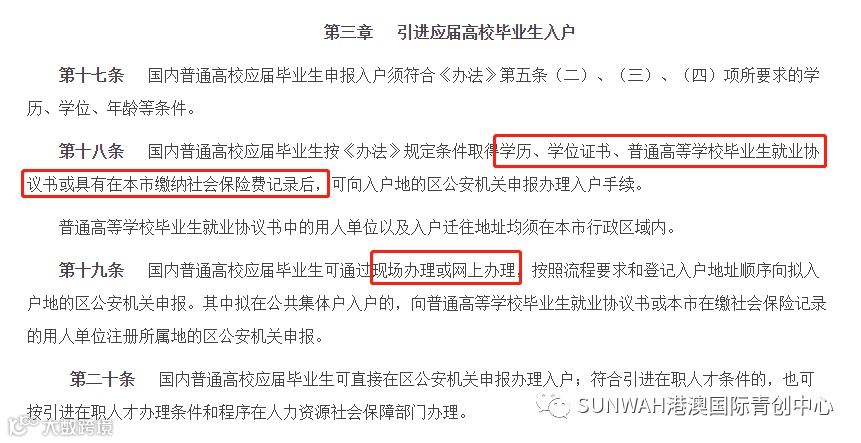 • 《细则》在“引进应届高校毕业生入户”一章中提到,国内普通高校应届毕业生按《广州市人民政府办公厅关于印发广州市引进人才入户管理办法的通知》(穗府办规〔2020〕10号)规定条件取得学历、学位证书、普通高等学校毕业生就业协议书或具有在本市缴纳社会保险费记录后,可向入户地的区公安机关申报办理入户手续。