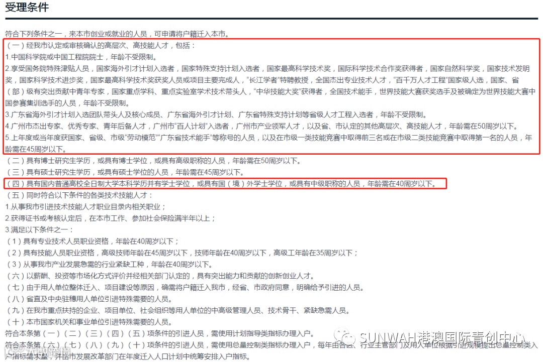 • 目前,根据广州市人力资源和社会保障局官网“引进在职人才入户”受理页面显示,来广州市创业或就业人员,符合“具有全日制本科学历、有学士学位证的,或具有中级职称的,年龄在40周岁以下”即可申请将户口迁入。