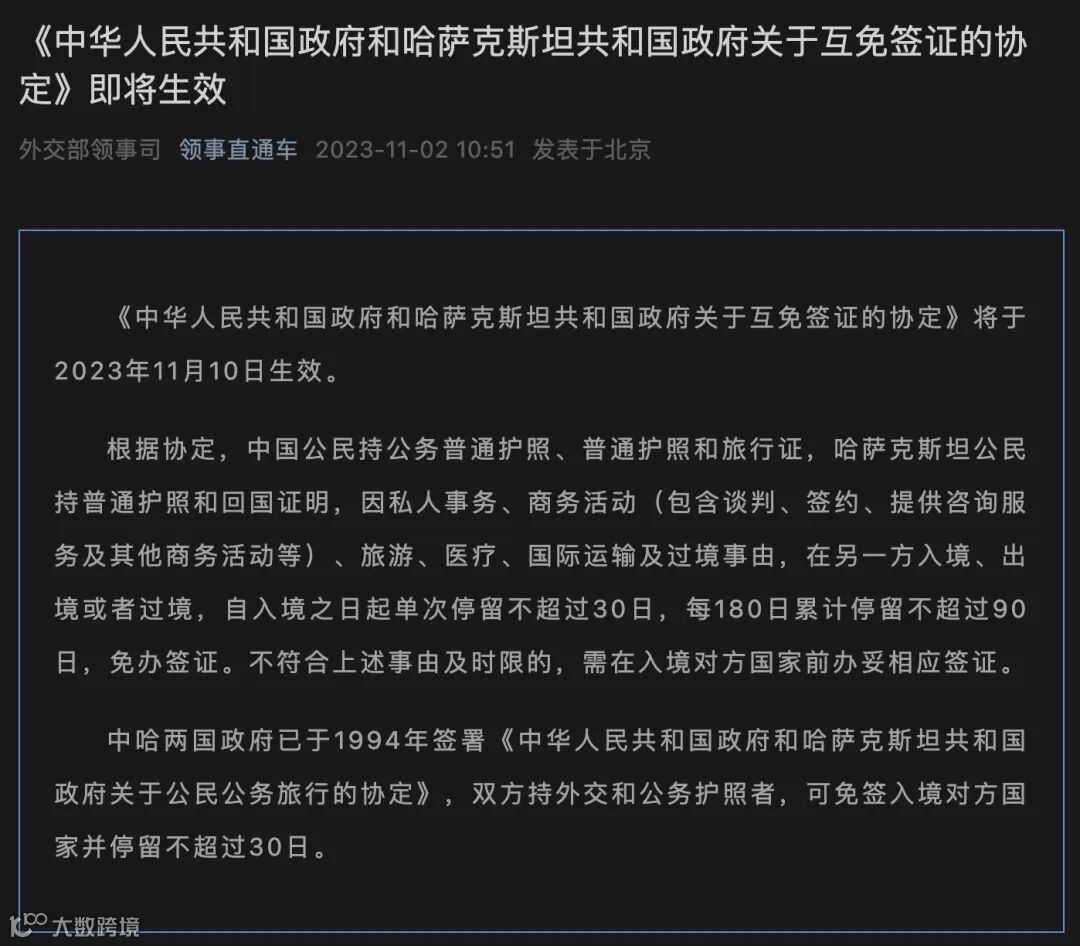 据“领事直通车”,《中华人民共和国政府和哈萨克斯坦共和国政府关于互免签证的协定》将于2023年11月10日生效。