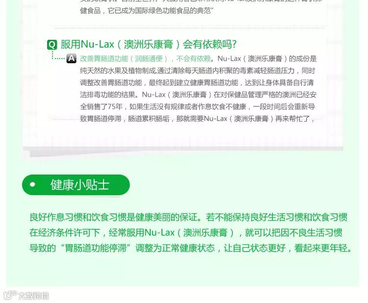 每个人对Nu-lax澳洲乐康膏反应的敏感性有一些差异,Nu-lax澳洲乐康膏是一种用天然有机植物和水果制成的功能食品,正因为它不是药物,所以它没有固定的剂量,根据生产和使用了将近70年的澳大利亚人的经验,一般情况下,成人一次用量为10克,体形高大一点的人也可以增大用量至15克。