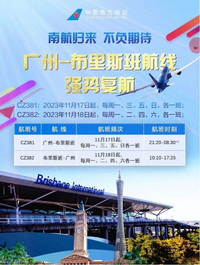 11月17日开始,中国南方航空重启广州往返布里斯班的直航航班: