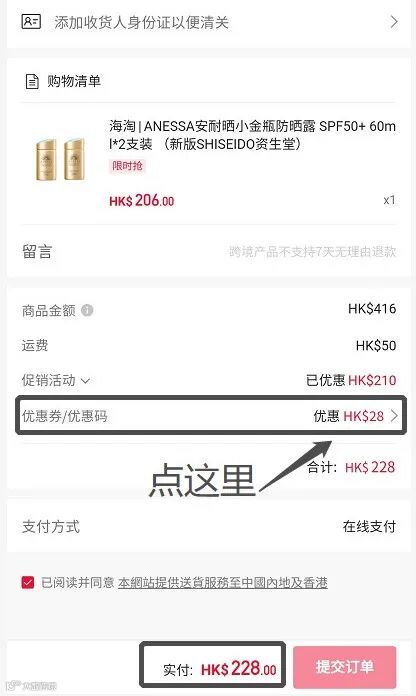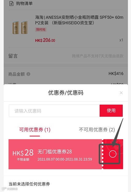 如果实付价格为228港币,则需要取消优惠券,这样更便宜,最终实付价206港币才是最划算的。如下图所示:
