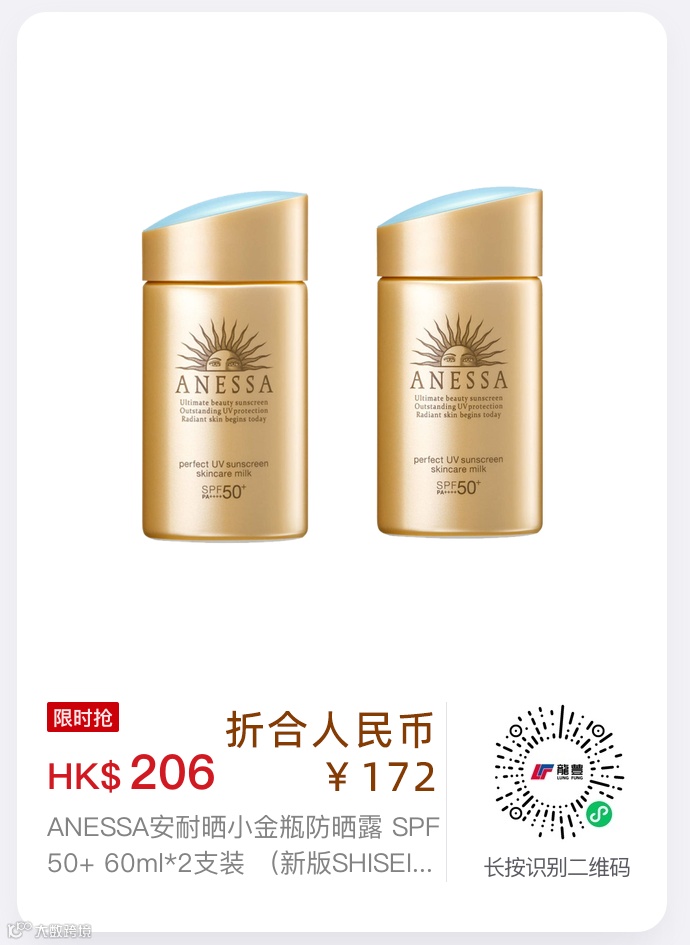 龙丰商城的商品满200港币包邮,这款防晒正好206港币,折合人民币172元左右,新用户千万不要使用无门槛优惠券哦,因为你使用了券以后,商品实际支付价格低于200港币,就需要额外支付邮费,就不划算了,切记呀,切记!