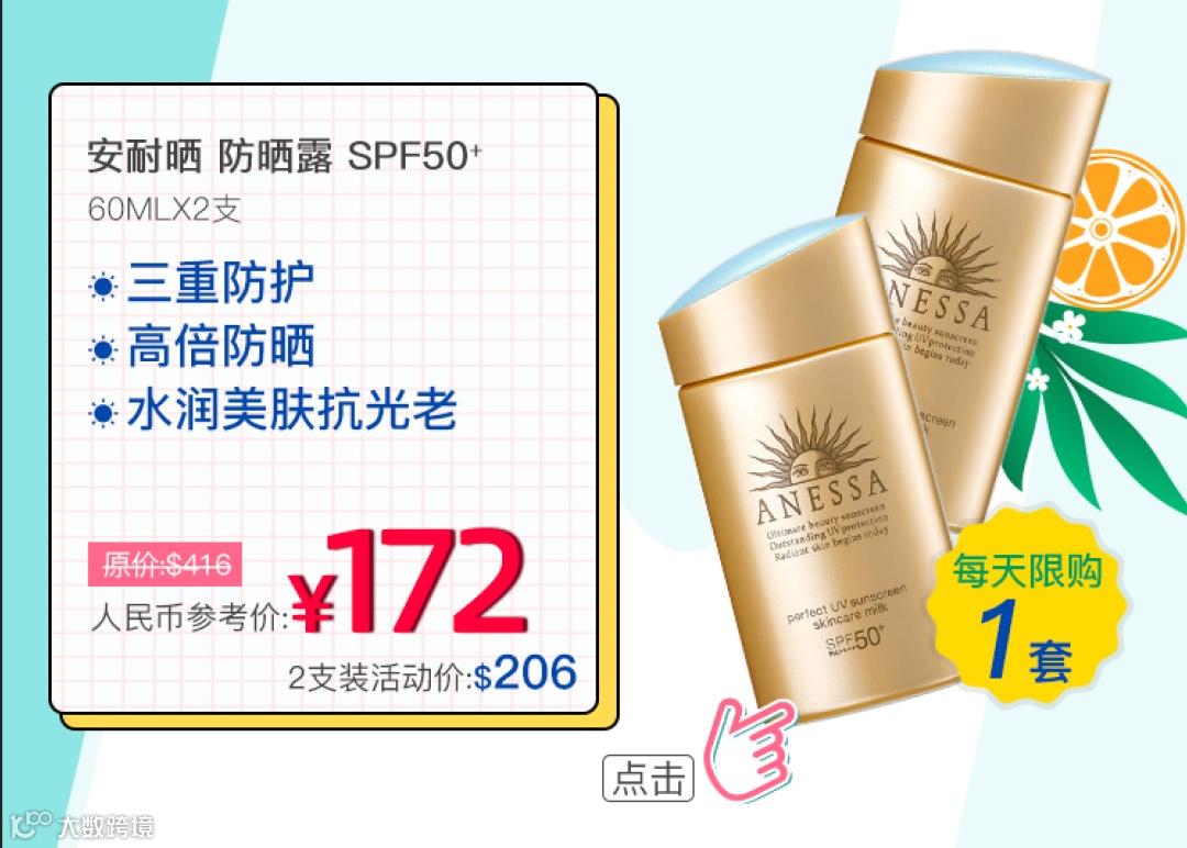 导读:资生堂安热沙金钻防晒乳60ml*2这是本猫见到的最低价了每瓶低至86元太划算了商品保质期很好质量没问题活动截