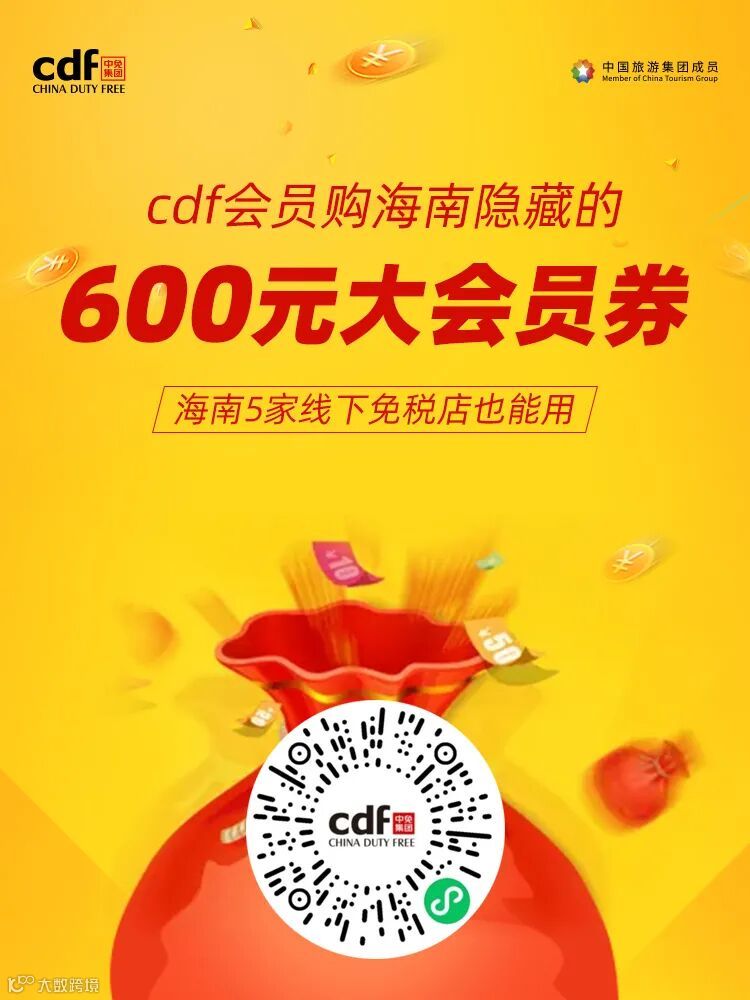 中免600元大会员券,适用门店三亚国际免税城、三亚凤凰机场免税店、海口日月广场免税店、海口美兰机场免税店、琼海博鳌免税店、cdf会员购海南(可直邮到家),券有效期到2021年12月31日,实际消费每满1000元可使用一张。