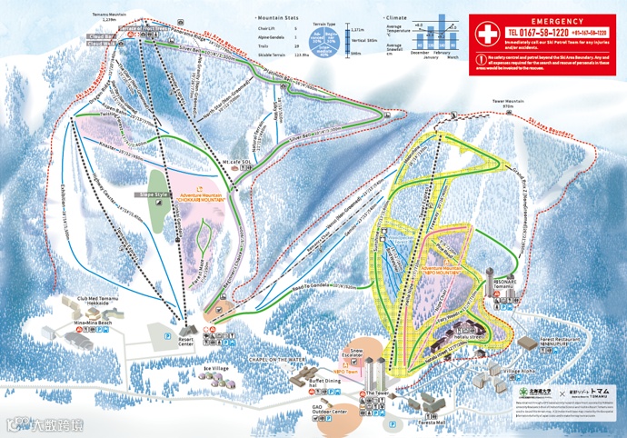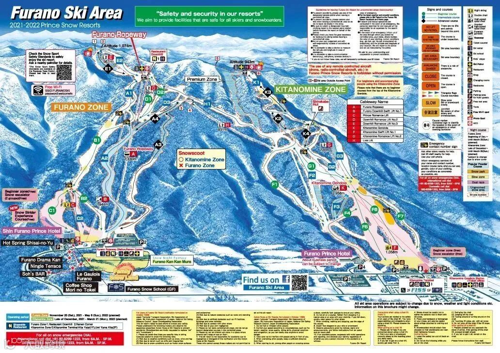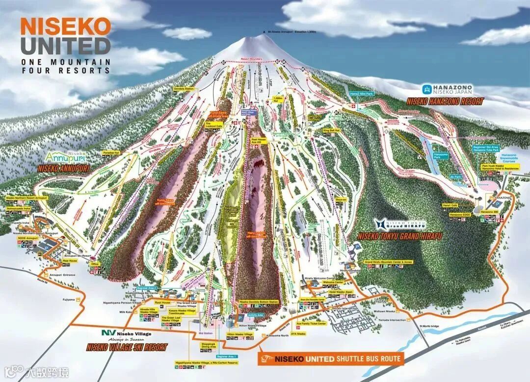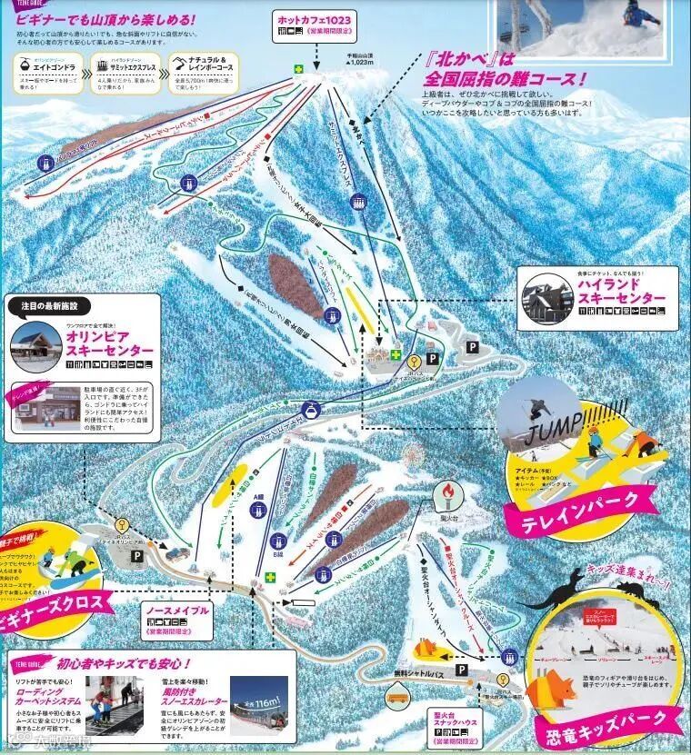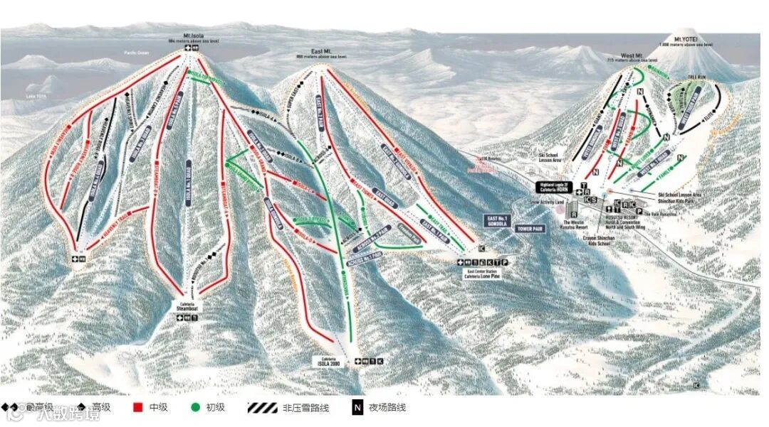 ⭐特点:北海道最大的滑雪场, 37条滑雪道分布在西山、东山、伊索拉山三座山上,拥有优质粉雪,总滑行距离达42公里。