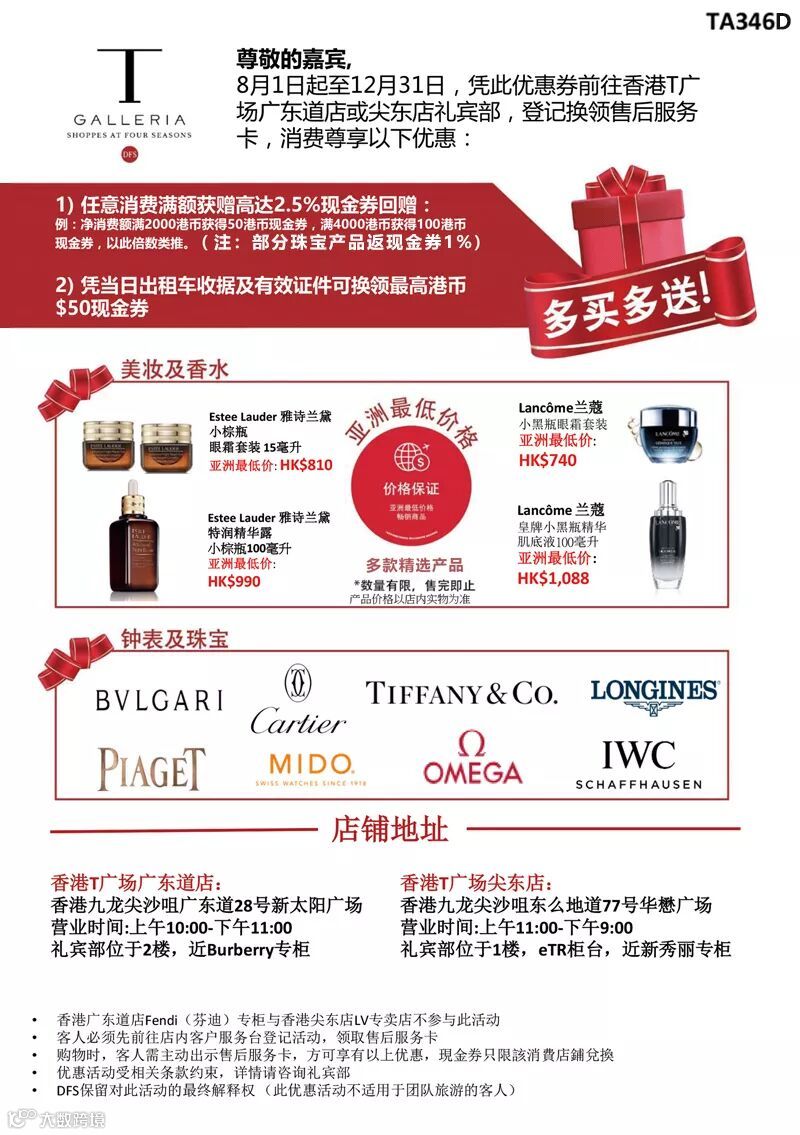 即日起至2018年12月31日,凭本文中的优惠券就可在香港DFS广东道店/尖东店购物时,享2.5%现金券回赠。