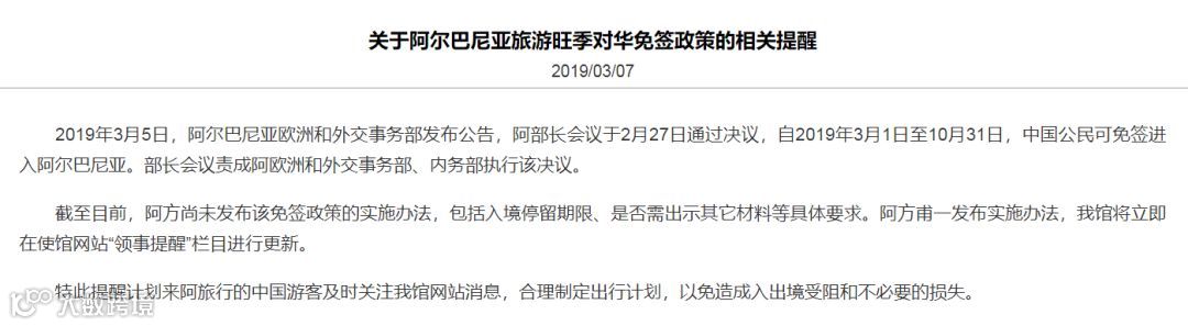 根据阿尔巴尼亚部长会议的决定,中国、俄罗斯、沙特阿拉伯、白俄罗斯、卡塔尔、阿曼、泰国和巴林8个国家的公民可以免签证进入阿尔巴尼亚旅游。其中,对中国公民的免签有效期为2019年3月1日至10月31日;对其他7国公民的免签有效期为2019年4月1日至10月31日。