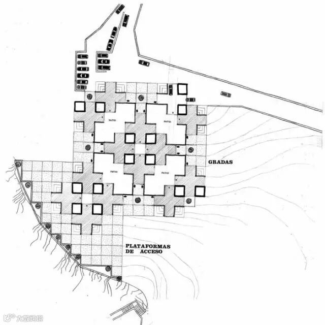 “红墙”就像一座在悬崖峭壁上凭空生成的城堡,它的设计明确参照了阿拉伯地中海地区的常见建筑形式,尤其是传统的北非城堡。设计师希望打破自文艺复兴以来对公共空间和私人空间越来越严格的界限划分,重新诠释地中海地区卡斯巴哈的传统建筑风格。卡斯巴哈是阿尔及尔古城的中心,整个城市像是覆盖在由阶梯纵横、错综复杂的小路组成的网络之下。