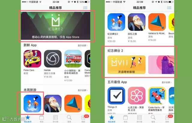 《纪念碑谷》这款小而美的游戏在3年前发布时就曾掀起全球热潮,续作《纪念碑谷2》于6月7日在苹果商店一经上线,便获得了 App Store 首页的 13 个推荐位(上下12个Banner+新游推荐位),并且在不足 24 小时的时间里飞速登上付费榜榜首。