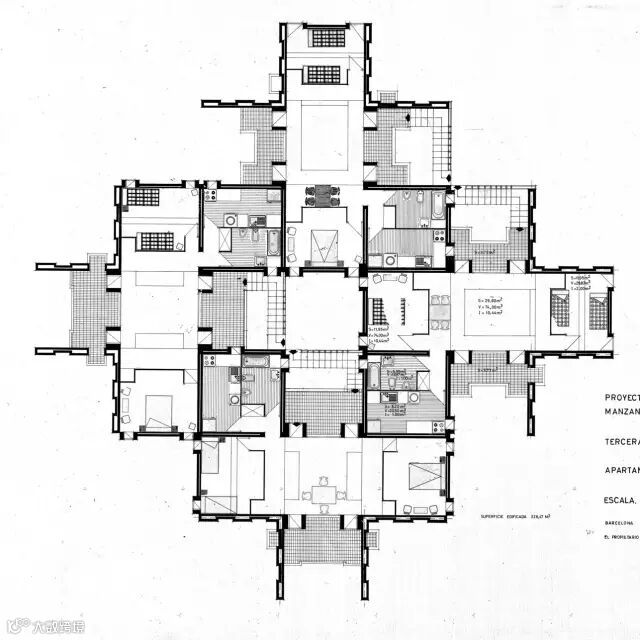 楼内共有50户公寓,一系列环环相扣的楼梯、高度变化丰富的平台和相互连接的桥梁是公寓之间的通道。这里共有三种户型:60平方米的工作室、80平方米的两居室公寓和120平方米的三居室公寓。屋顶露台还有游泳池、日光浴室、桑拿房等供住户休闲使用的公共空间。