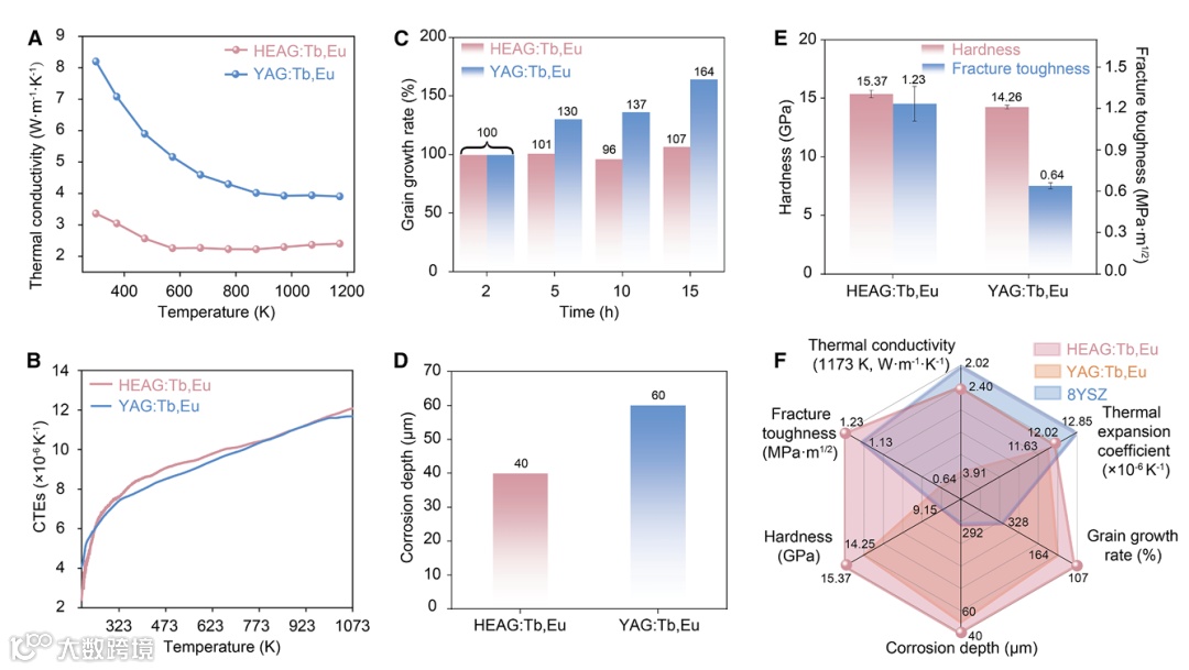 图5D的CMAS腐蚀,HEAG腐蚀深度40 μm,小于YAG的60 μm。图5E的力学性能,硬度15.37 GPa,断裂韧性1.23 MPa·m¹/²,都比YAG高。