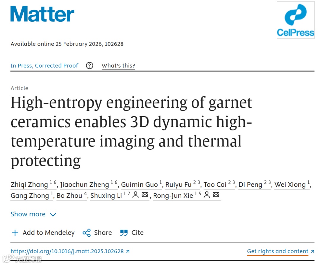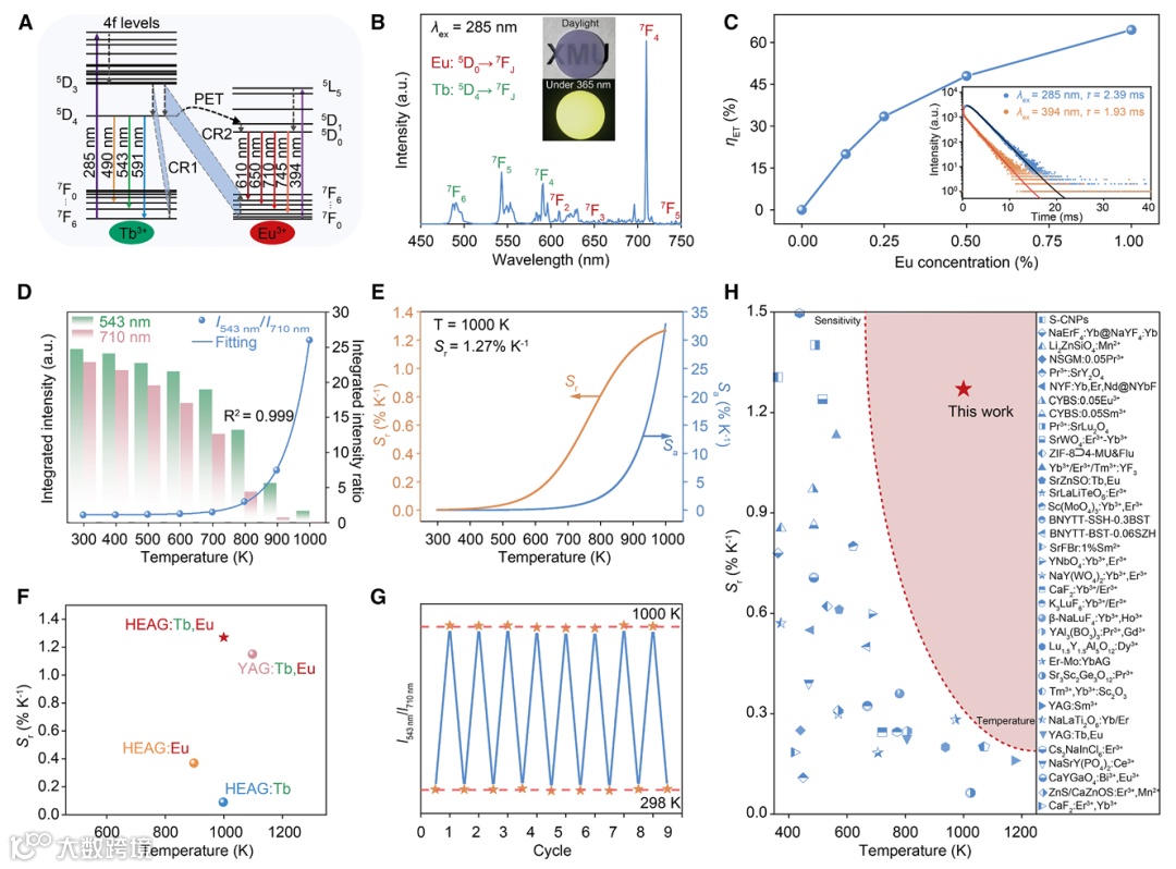 厦门大学解荣军团队最近在《Matter》上发了一篇,把这两件事塞进同一块陶瓷里。他们在钇铝石榴石(YAG)的骨架上,用Y、Gd、Tb、Lu、Yb五种稀土等摩尔共掺,构建了一个高熵基质,再往里掺Tb³⁺和Eu³⁺当发光中心。这套设计的门道在于:Tb³⁺和Eu³⁺之间有一种叫“交叉弛豫”的能量传递,高温下Tb³⁺发光掉得很快,Eu³⁺掉得慢,两个信号的比值随温度单调变化——于是这块陶瓷自己就成了一个光学温度计。
