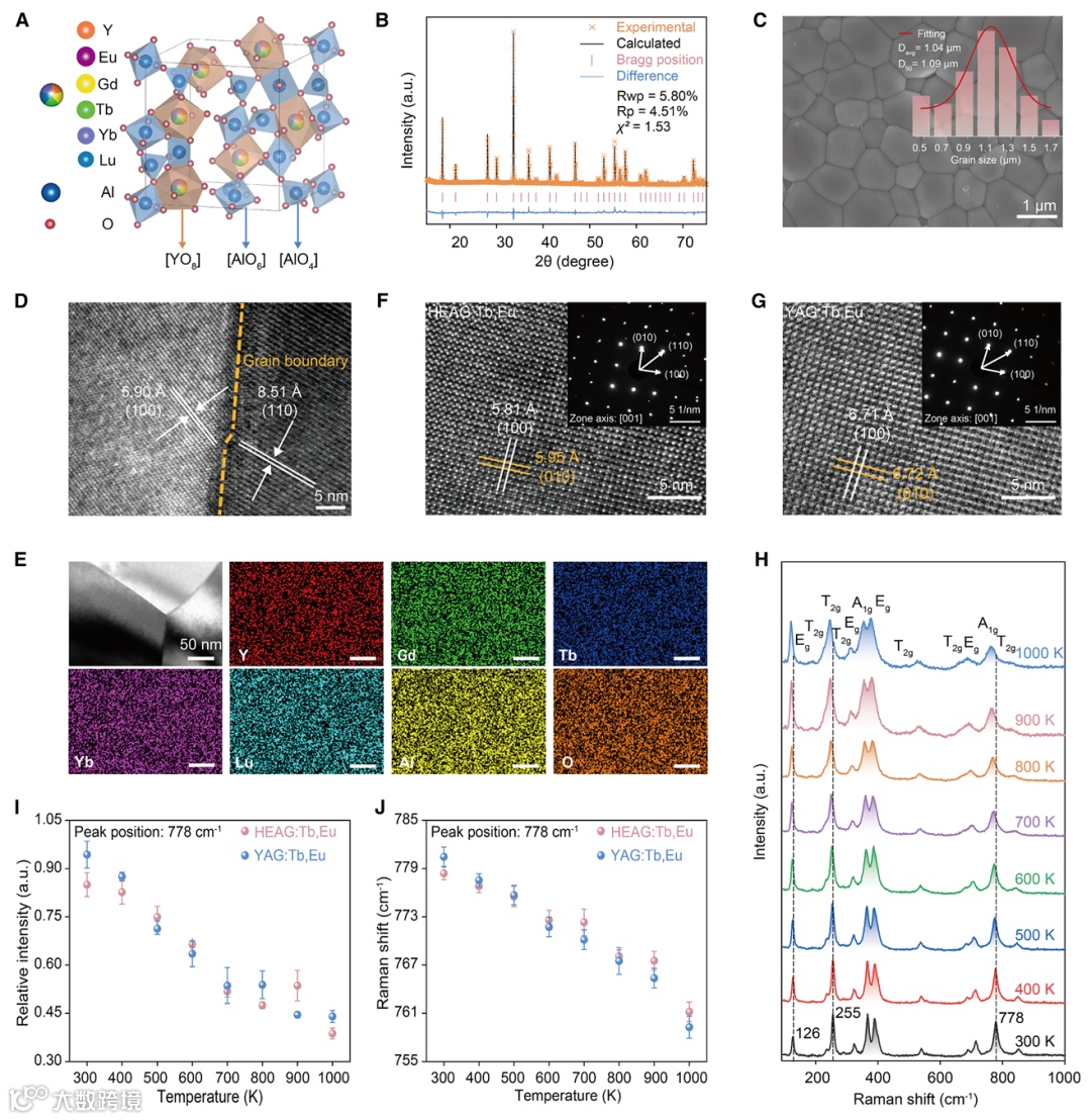 先看图1B和1E的设计思路。YAG本来是个规整的晶体,Y³⁺占十二面体格位。现在把Y换成等摩尔的Y、Gd、Tb、Lu、Yb——五种稀土离子半径不一样,挤在同一个格位里,晶格必然扭曲,但图2B的XRD精修显示,纯相石榴石结构,没有杂相;图2E的EDS面扫,五种元素均匀分布,没有偏析。