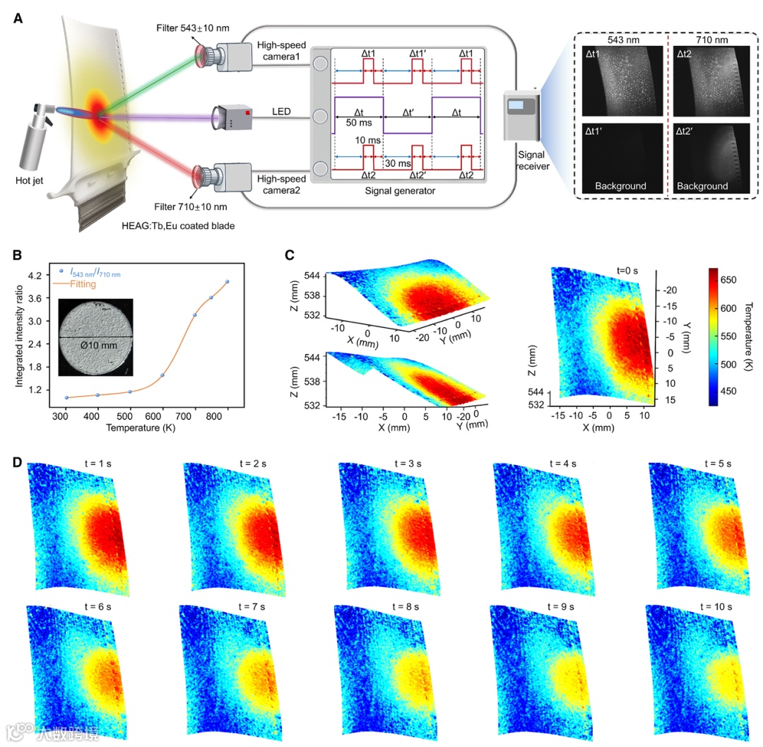 最后他们把这陶瓷做成涂层,喷在真实涡轮叶片上,用385 nm LED一闪,两台相机同时拍543 nm和710 nm的光,直接重建出叶片表面的3D温度场,动态实时,热射流停了还能看10秒降温过程。