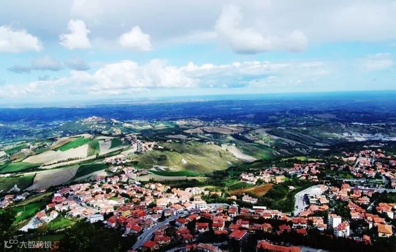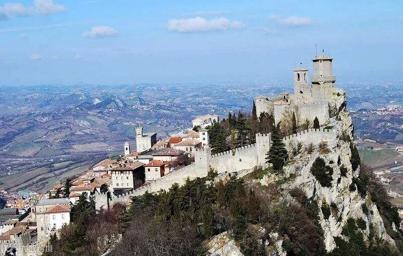 圣马力诺是个典型的"袖珍小国",全国只有3万多人,是全球最老、最小的国家之一。虽然国土面积小,景致却不输世外桃源。站在圣马力诺蒂塔诺山顶的古堡前,放眼向四周眺望,东面是碧波万顷的亚得里亚海,浩浩荡荡,一望无垠;北、西、南三面山峦、平地、石岗、土丘重叠起伏,遍地都是葡萄园和果园,许多乳白色房屋点缀其间,别有一番诗情画意。