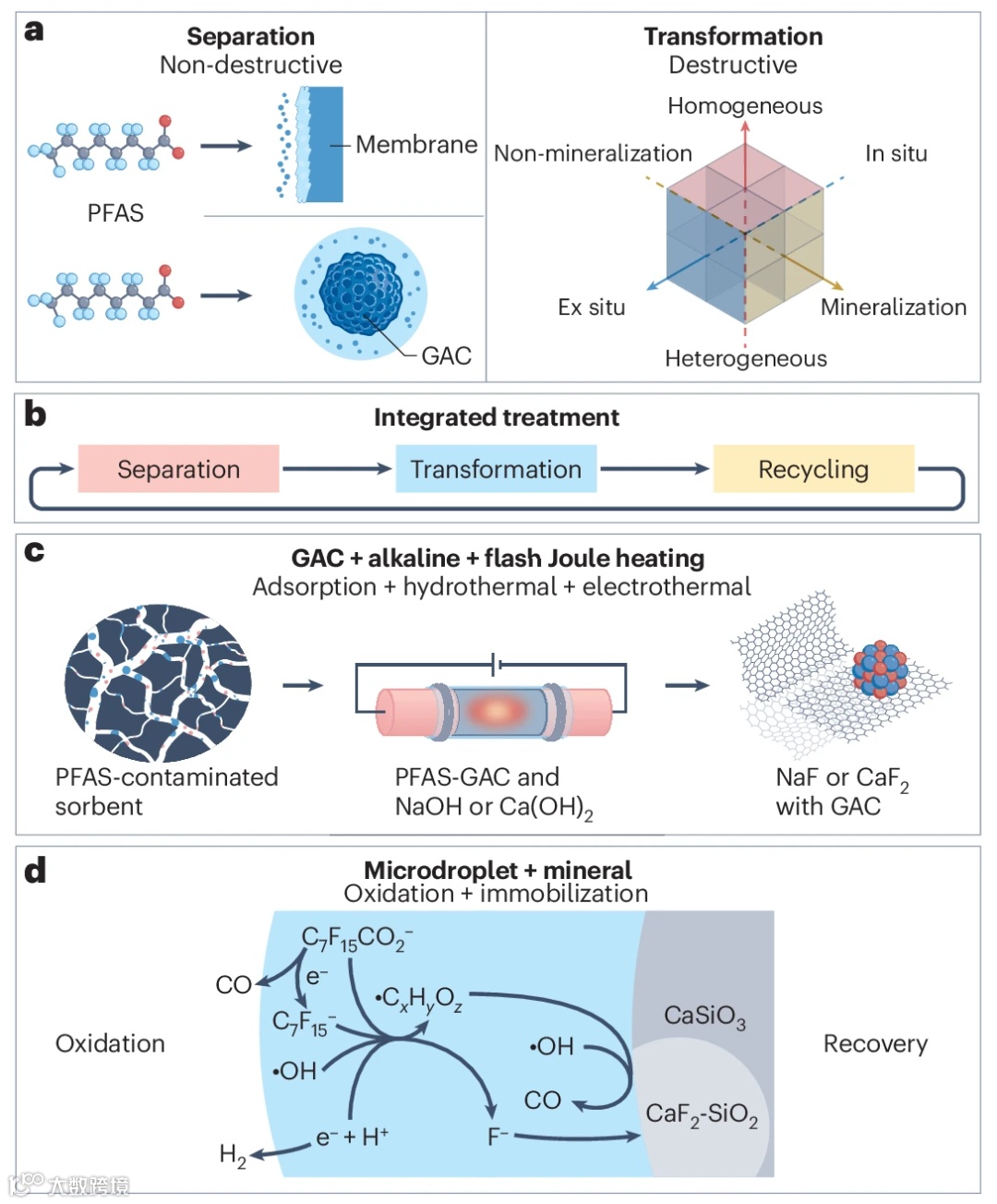 微滴-矿物界面工艺(图1d):阐释了另一项前沿的界面强化策略。带电微滴与硅灰石(CaSiO₃)等矿物颗粒碰撞时,在气-液-固三相界面产生极端物理化学环境,能同步驱动PFAS的还原与氧化反应,实现高效降解并将释放的氟离子固定于矿物中。