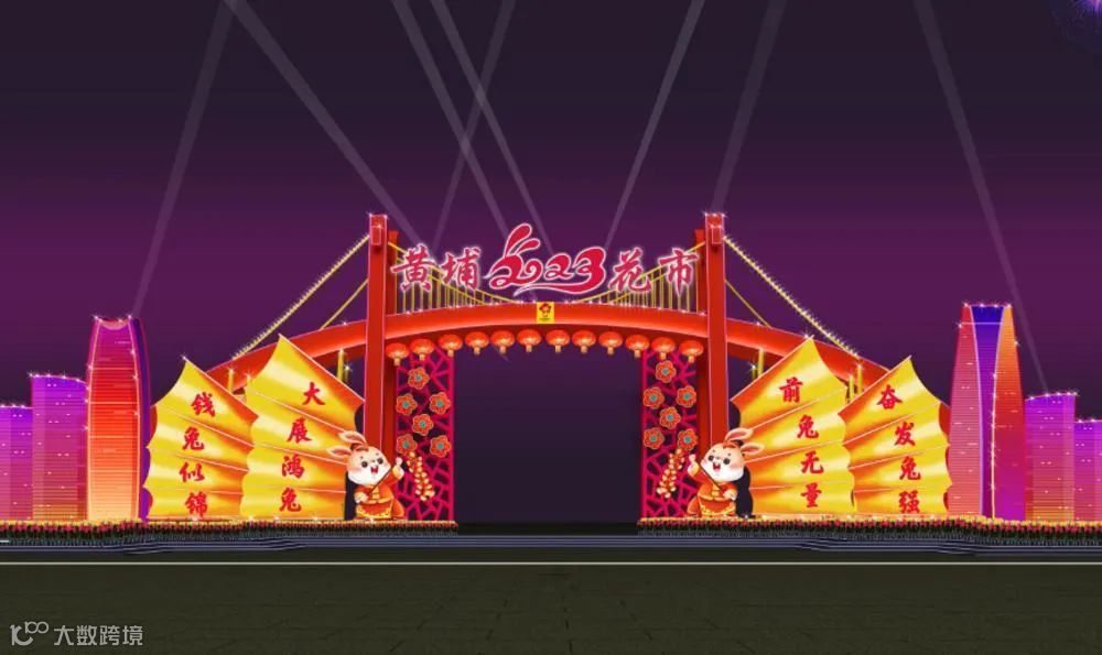 其中,黄埔公园会场牌楼以“海上门户、活力黄埔”为主题,体现海上丝路、千年古港的历史文化底蕴;绿轴广场会场牌楼将突出“兔年”元素,融合科技感与现代感;开放一路会场牌楼以“紫气东来、踔厉奋发”为主题,以祥云拱桥为主体造型,突出中新广州知识城LOGO,融入海浪等元素,体现乘风破浪之意。
