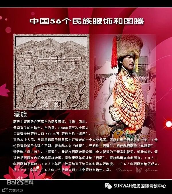 简介:藏族是汉语的称谓。西藏在藏语中称为“博”,生活在这里的藏族自称“博巴”。素有“世界屋脊”之称的西藏,美丽神奇,是藏族的主要聚居地,在现有130多万人口中,藏族占95%,是中国古老的民族之一。