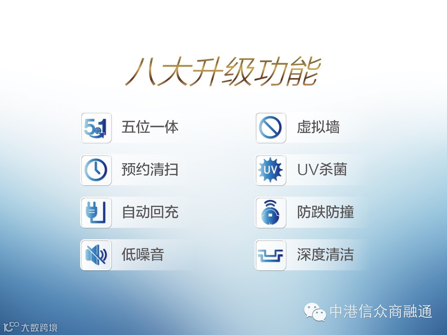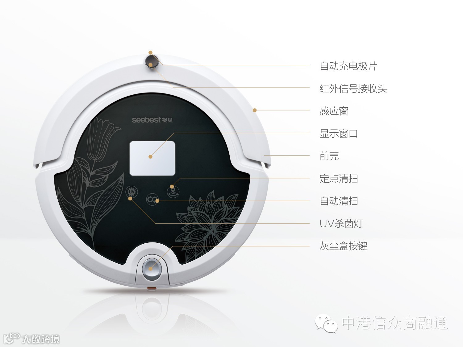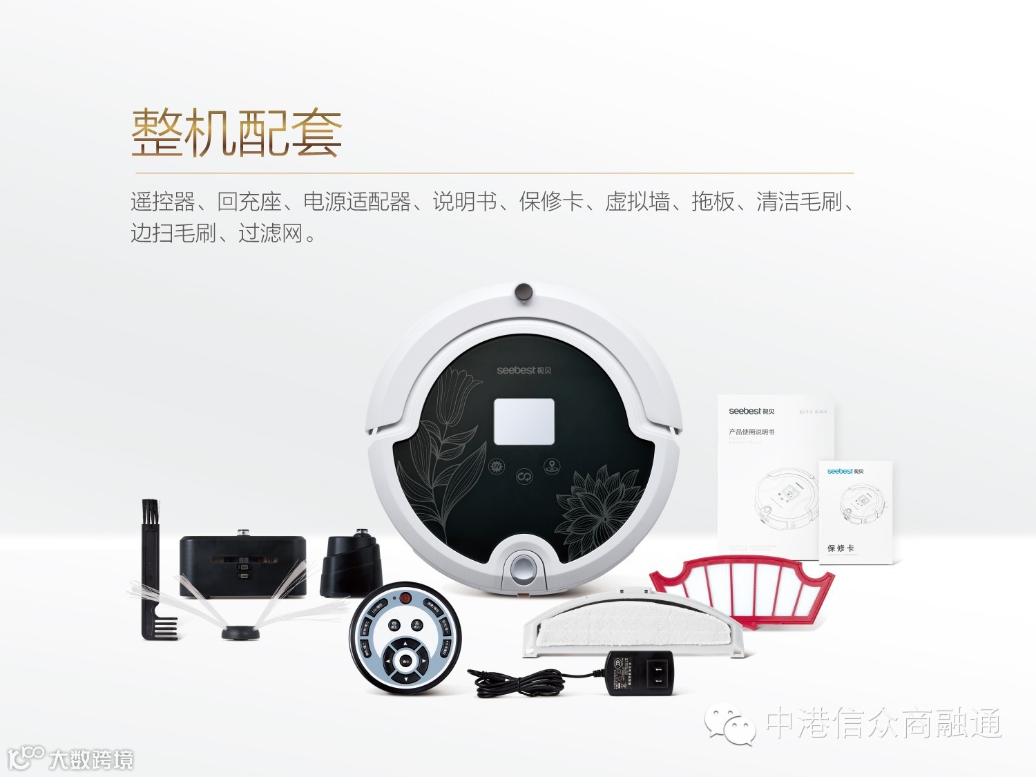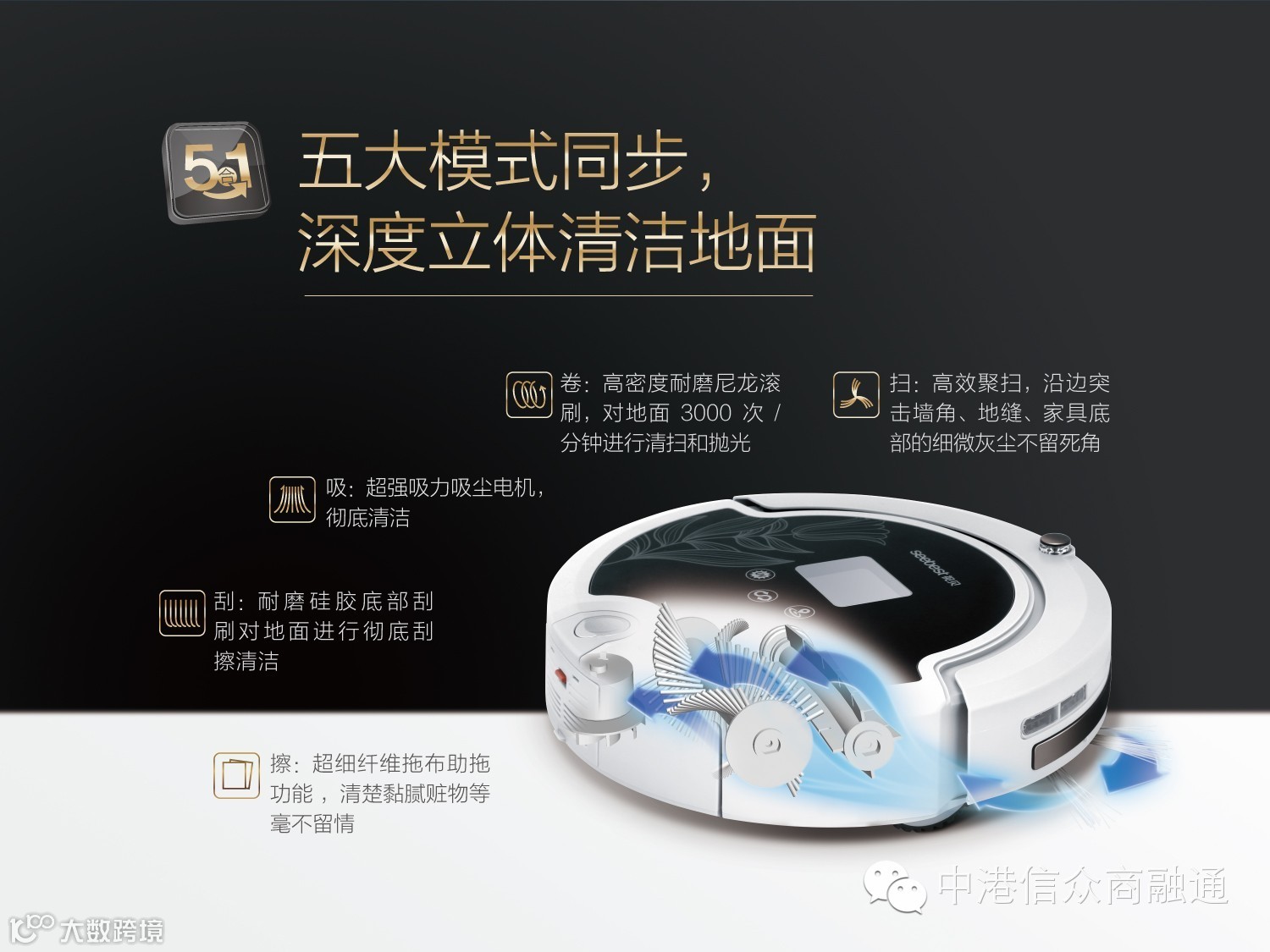 在原有智能吸尘器基础上外挂拖板拖布,同时吸尘、清扫、拖地、杀菌消毒、空气过虑,清洁率100%,可以自由拆装使用。杀菌消毒功能