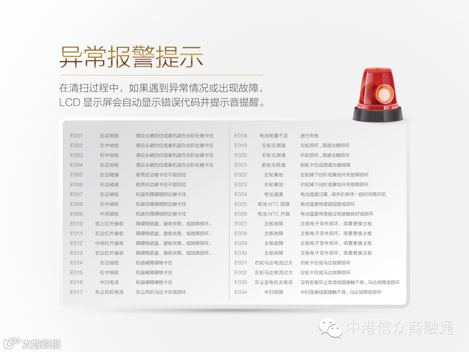 保洁机器人的底部与前方都有电子眼,总共32个感应器,准确识别垃圾及障碍物,对桌子、椅子、家具感应更灵敏,在不碰撞的情况下可以把边、角清扫干净。遇到障碍物、楼梯、台阶不会掉下来,自动开启防跌落、防缠绕、自救功能。智能防跌落