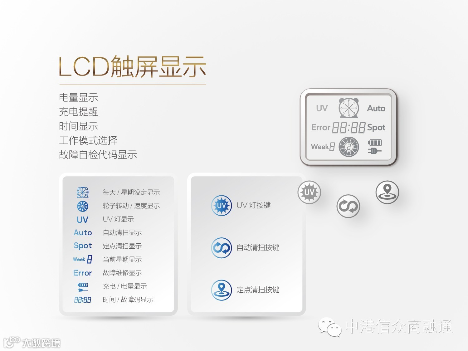 机器的每个动作状态都会显示在主机的液晶屏上,对机器实时了解与呵护:预约天数显示、轮子速度、自动清扫、定点清扫、当前星期、电量以及故障显示。触摸按键