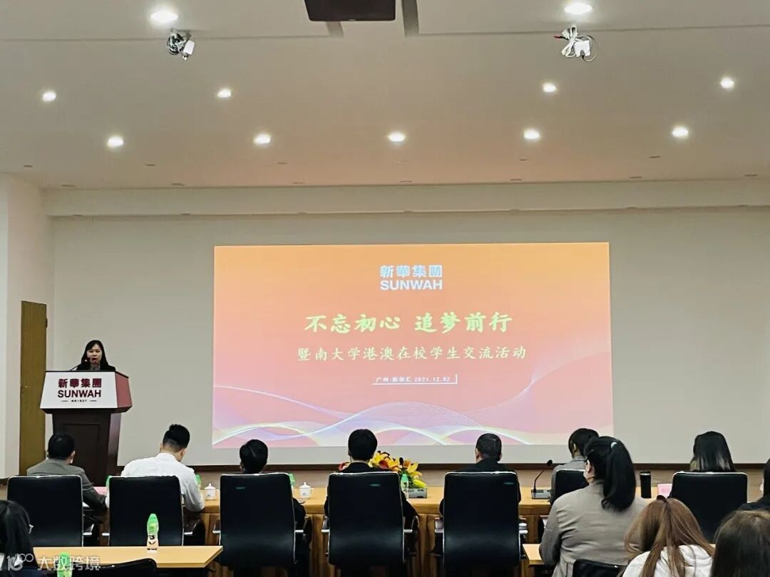 次活动由新华集团外事办助理阮秋香主持,首先参观了广州新华汇并观看了新华集团宣传片,介绍了新华汇-大健康产业园(孵化器)的情况、Sunwah Innovation、SWIIP、GYLN ,同时介绍了新华港澳国际青创中心,关于创新创业青年未来发展的相关内容。