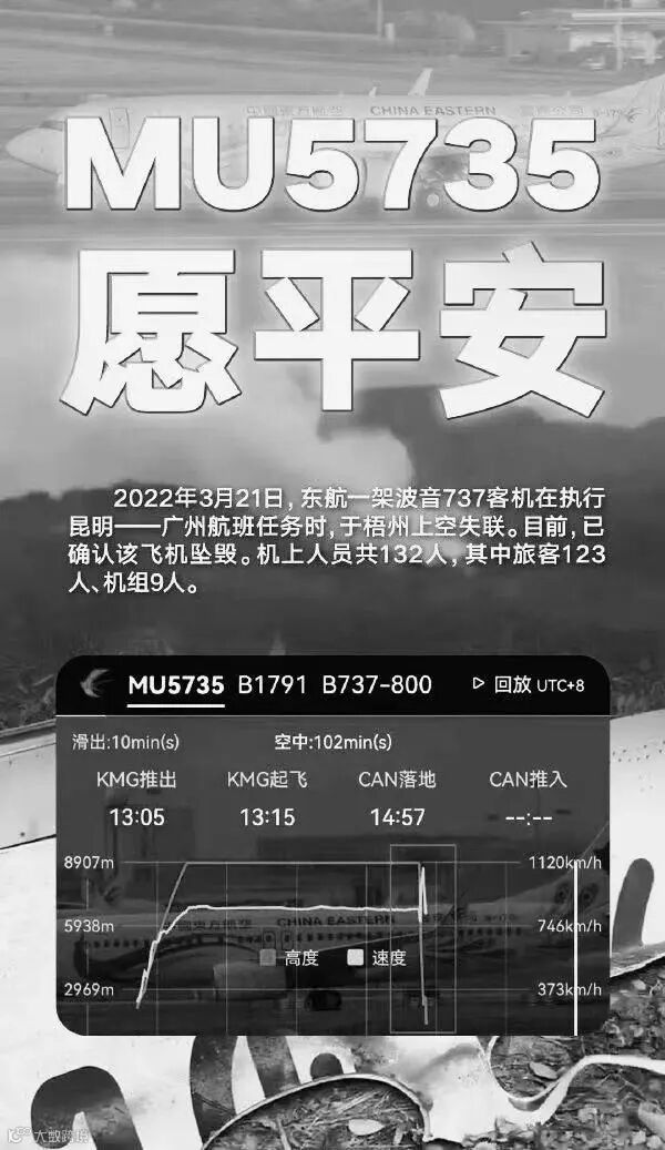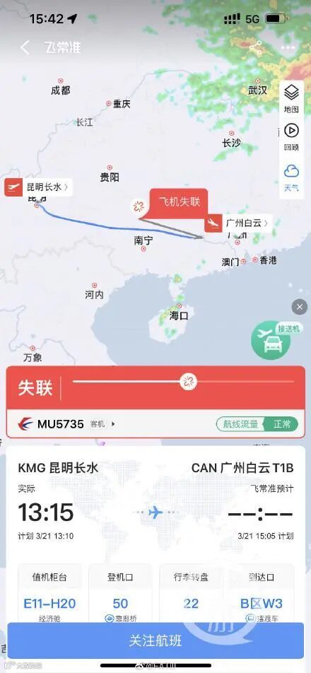 3月21日的MU5735航班由东航云南公司波音737飞机执飞,飞机编号为B-1791,机龄6.8年,属于较新的客机。该航班原计划下午13点10分从昆明长水机场起飞,15点05分到达广州白云机场,但飞机13点15分起飞后,于下午14点20分左右同地面失去联系。