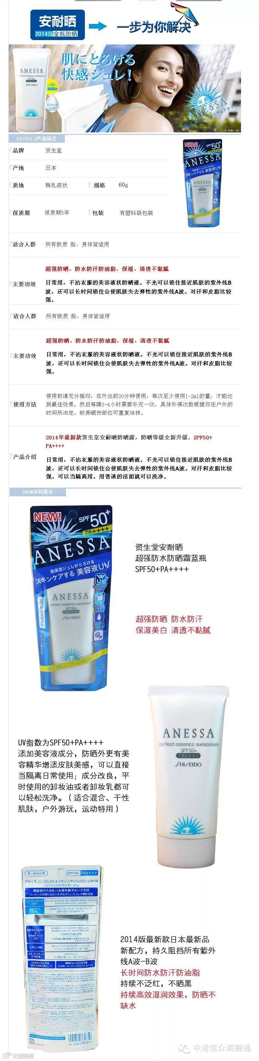 来看看资生堂安耐沙白瓶防晒霜的功效:这款白色瓶装属于户外活动防汗型。防水防汗,生活防晒清爽配方,适合日常生活及一般户外活动。ANESSA独创新技术『花瓣状氧化锌』即使在高SPF下一样透明、服贴、无负担,除双重隔绝UVA、UVB紫外线的伤害,并含MT诱导成分,有效防止紫外线侵入肌肤深处伤害细胞内的DNA,是绝佳耐水、耐汗、耐皮脂的防护圣品,物理性防御紫外阻隔紫外线伤害皮肤细胞,保持肌肤健 康,质感清爽柔顺,与皮肤自然融合,能修饰肤色创造素肌感、不黏腻,亦可当隔离霜使用,经过敏感性肌肤试验,将导致过敏的机会降至最低,防水性高不易脱落。强力防止到达地球的所有紫外线(A波-B波),而且采线的功能持久不断。且防油脂。 舒适干爽,肌肤在紫外线防止效果持续中显得高(贵)的质感。用了资生堂独自的处方技术,具有极强的耐水性,能使防止紫外.