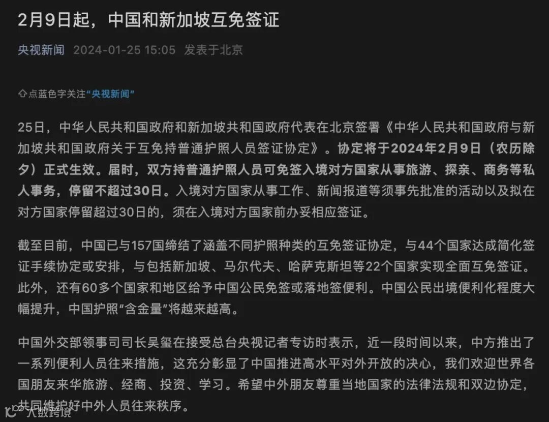 截至目前,中国已与157国缔结了涵盖不同护照种类的互免签证协定,与44个国家达成简化签证手续协定或安排,与包括新加坡、马尔代夫、哈萨克斯坦等22个国家实现全面互免签证。此外,还有60多个国家和地区给予中国公民免签或落地签便利。中国公民出境便利化程度大幅提升,中国护照“含金量”将越来越高。