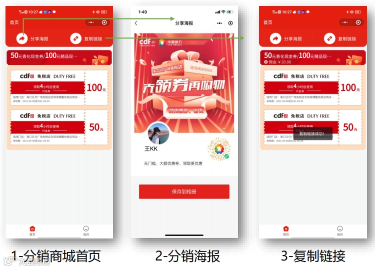 分销员生成自己的分享海报保存至相册或复制链接——发到微信朋友圈、好友、微信群或者直接出示给用户即可扫码或点击进去领券。