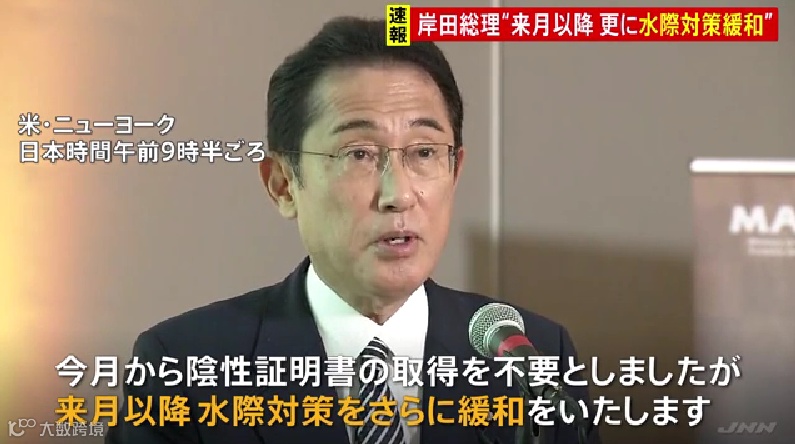 岸田首相:“从本月开始不需要取得阴性证明书,下个月开始将进一步放宽入境政策。”