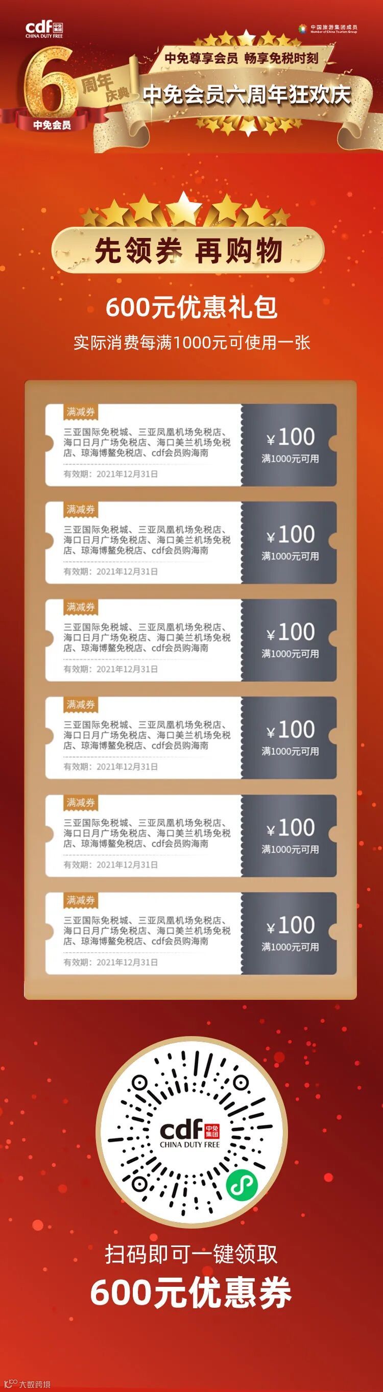 中免会员6周年狂欢继续!600元优惠券领取中!