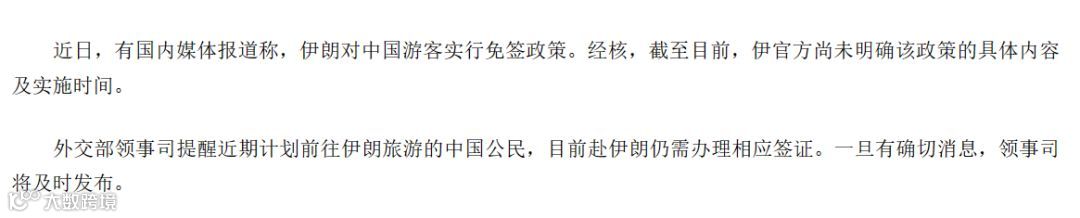 7月初,国内大量媒体报道伊朗开始对中国游客免签,随后中国领事服务网就专门对此辟谣。伊官方尚未明确该政策的具体内容及实施时间,近期计划前往伊朗旅游的中国公民,目前赴伊朗仍需办理相应签证。